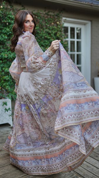 The High Tide Maxi Skirt in Odyssey Print from our Resort 2023 Collection, High Tide. A silk linen maxi skirt featuring a high waist with nautical inspired buttons down the centre front, finished with hemp and beaded trims, side seam pockets and a removable belt.